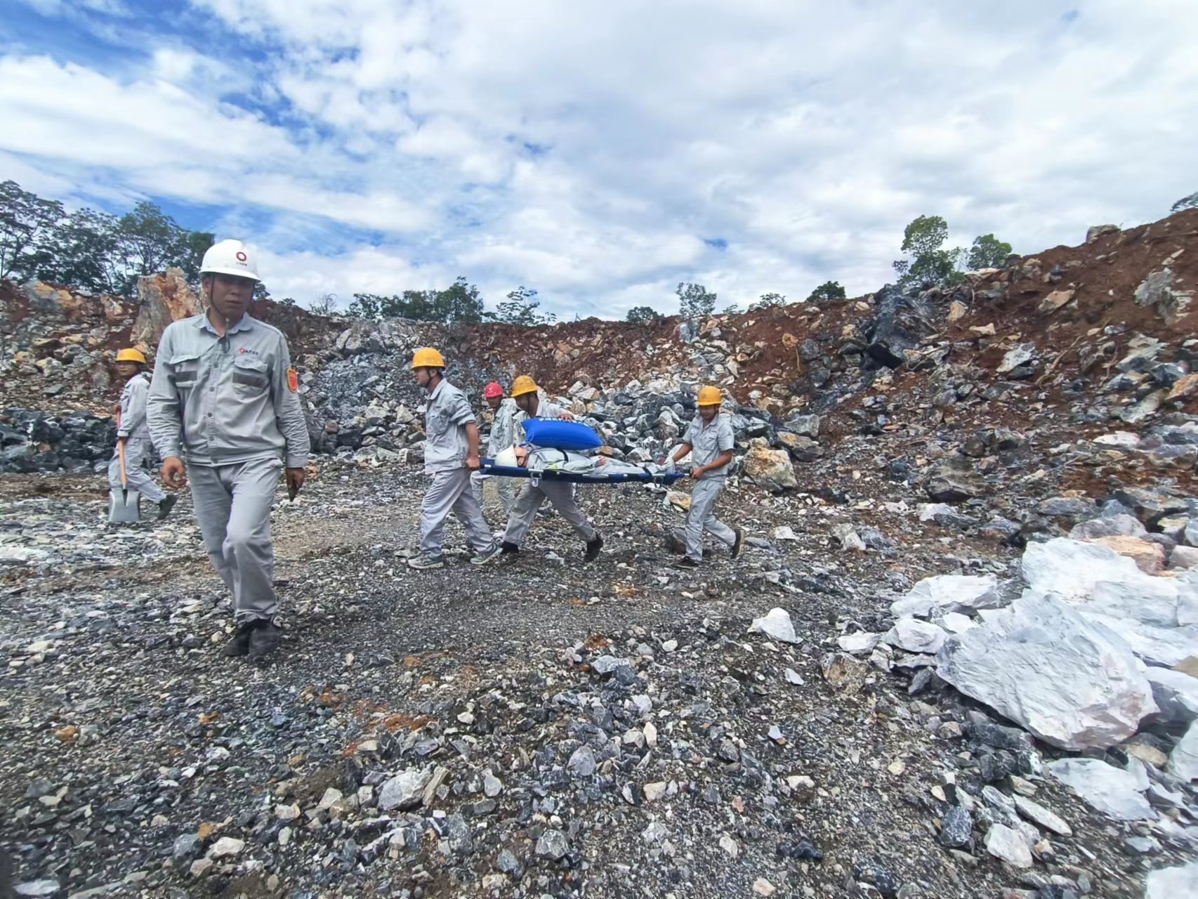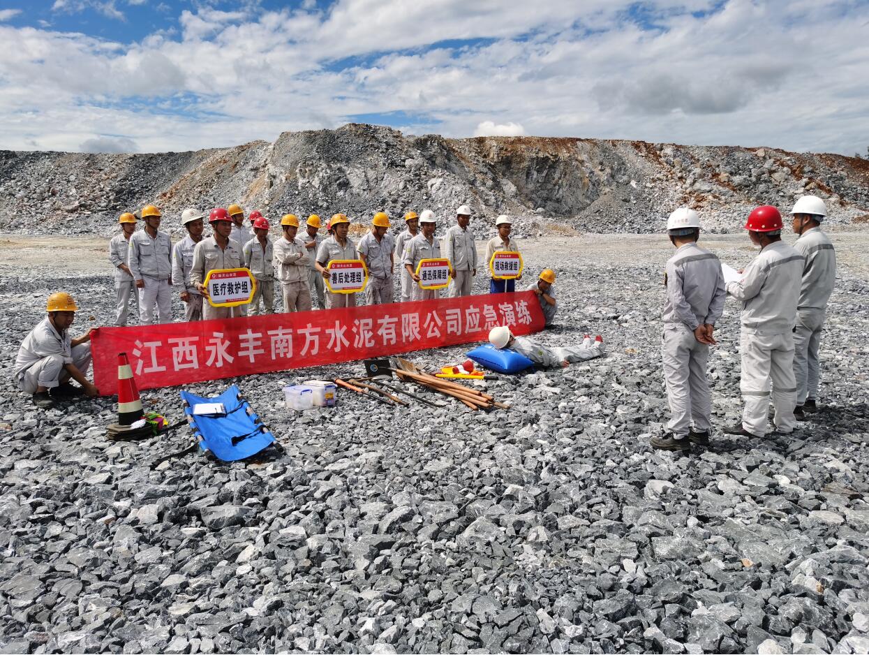為全面貫徹落實(shí)公司礦山安全生產(chǎn)方針與目標(biāo),切實(shí)做好汛期邊坡垮塌、滑坡預(yù)防工作,永豐礦于2022年6月30日開展邊坡滑坡事故應(yīng)急救援演練,隨著總指揮一聲令下:“演練開始!”兩個鉆工正在平臺實(shí)施鉆孔作業(yè),礦山安全員在不遠(yuǎn)處巡回檢查,突然發(fā)生大面積邊坡滑塌事故,一鉆工被土石方掩埋,安全員立即上報領(lǐng)導(dǎo)請求救援,領(lǐng)導(dǎo)得到事故報告后立即向永豐縣安監(jiān)局匯報并立即成立應(yīng)急指揮部并組織救援隊(duì)前往救援,在應(yīng)急指揮部指揮下,安全警戒人員在路口拉設(shè)警戒線,應(yīng)急救援人員趕往現(xiàn)場用手工工具進(jìn)行挖掘,找到傷員后將其抬至擔(dān)架上轉(zhuǎn)移到安全地帶后進(jìn)行緊急救援處理,救護(hù)車到達(dá)現(xiàn)場后將傷員抬入救護(hù)車離開。