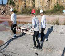 演練前,礦山應急小組對全體職工進行了組織動員,確保演練安全、有序。此次演練的場景為一名員工在礦山生產(chǎn)作業(yè)時收到高處落下的石頭砸傷手臂。演練開始后,安全員立即電話告知礦山應急小組并啟動物體打擊應急預案,應急小組立即趕到現(xiàn)場對傷員的傷口進行了包扎處理并用擔架將傷員運送到安全區(qū)。