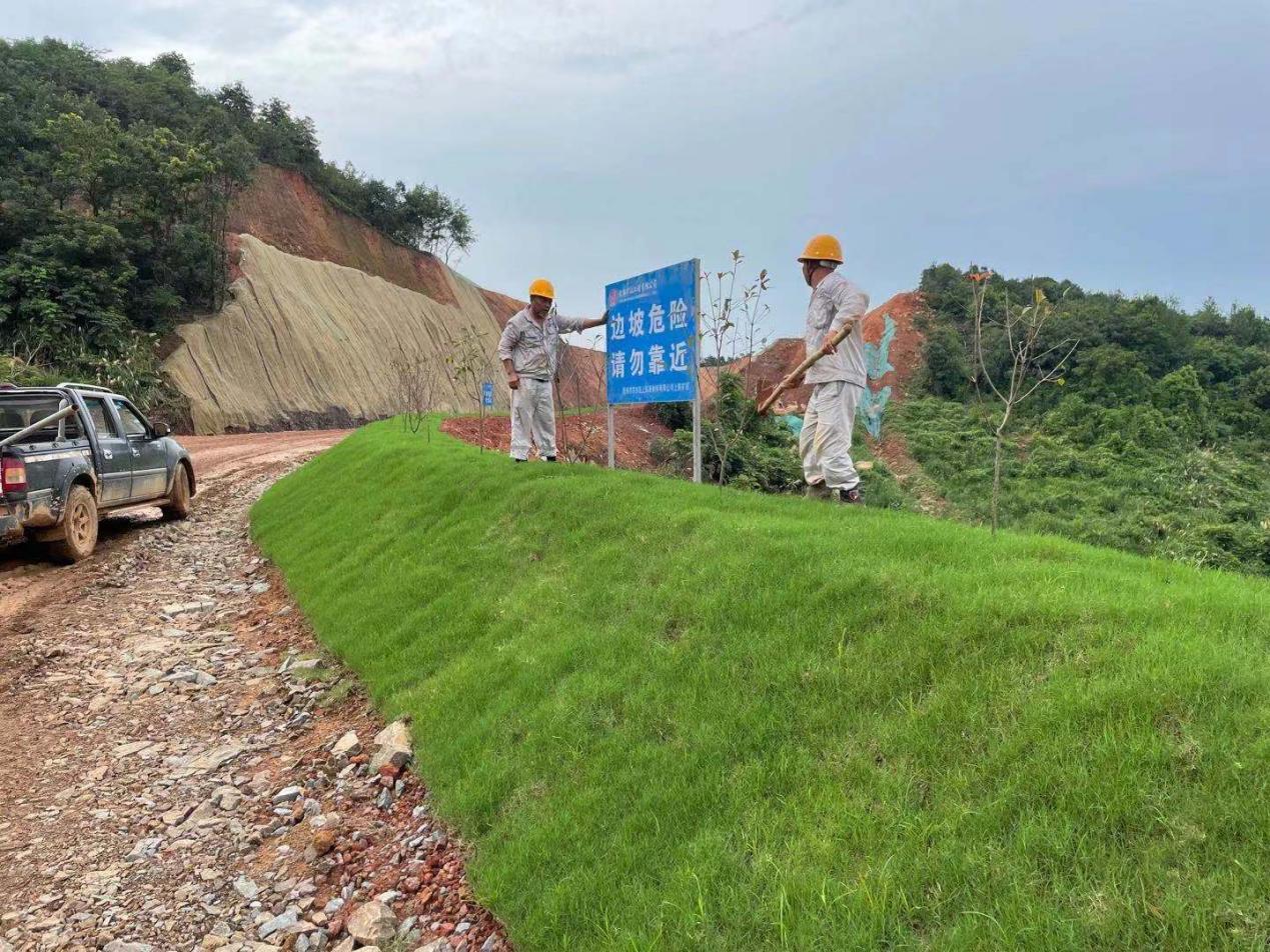 塵土飛揚(yáng)、機(jī)器轟鳴、滿山荒蕪,這是很多人對礦山的第一印象,因?yàn)榈V山開采往往會造成山體植被大面積破壞,巖石裸露;而在東鄉(xiāng)礦,我們的工作人員正在復(fù)綠的擋墻上設(shè)置安全警示牌。礦山也秉承堅(jiān)持邊開發(fā)、邊治理的原則,開展生態(tài)環(huán)境保護(hù)治理。